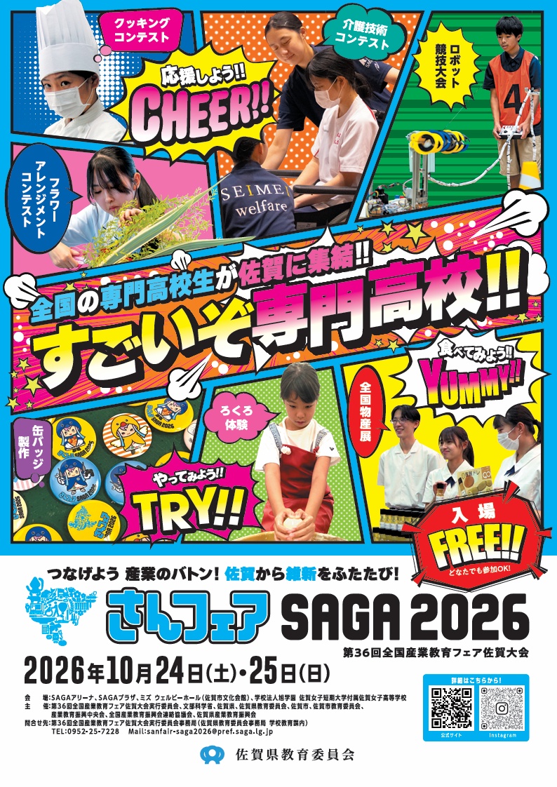 第36回全国産業教育フェア佐賀大会「さんフェアSAGA2026」のご盛会を心よりお祈り申し上げます。 2026.04.16 第36回全国産業教育フェア佐賀大会「さんフェアSAGA2026」のご盛会を心よりお祈り申し上げます。 「さんフェアSAGA2026」チラシ(PDF) 「さんフェアSAGA2026」ホームページへ 一覧へ